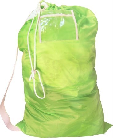 HANGING SHOULDER STRAP LAUNDRY BAG (2125). Your trips to the laundry are made easy using this 100% Nylon Laundry Bag with an extra wide shoulder strap. This bag is roomy enough to hold large loads. The extra wide shoulder strap makes transporting easy, while the lock draw string keeps bag securely closed. Measures 24" x 36". Lock draw string with closures. Reinforced grommets for secure hanging. Clear window pocket for easy identification. Perfect for camp, school, camping, dorm, apartment living. Or for travel.